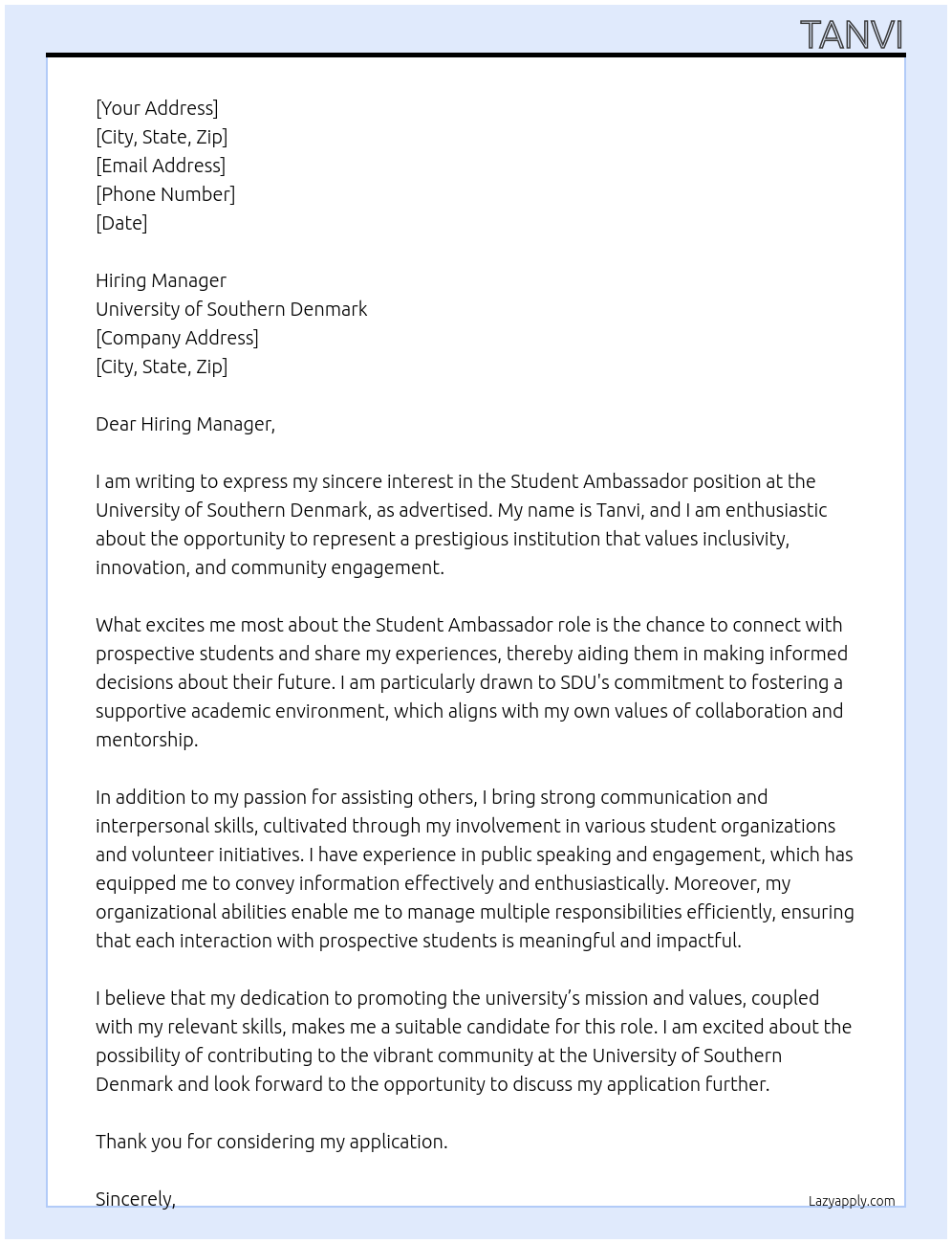 Check out these student ambassdor cover letter sample and examples previously used by job seekers to land on job interviews as student ambassdor. Use our AI cover letter generator to create a personalized cover letter as student ambassdor.