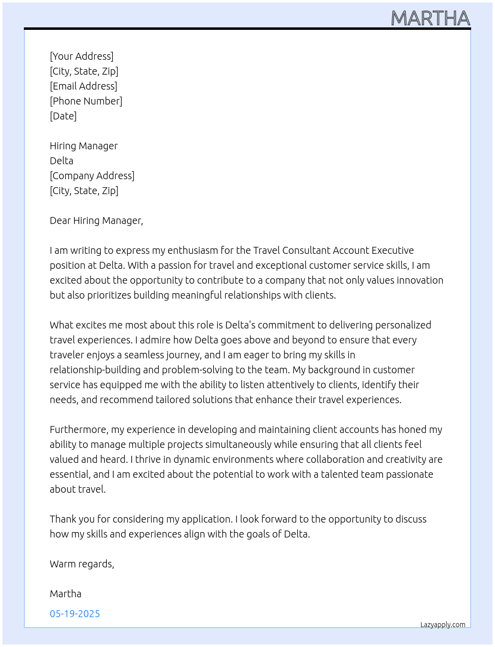 Check out these travel consultant account executive cover letter sample and examples previously used by job seekers to land on job interviews as travel consultant account executive. Use our AI cover letter generator to create a personalized cover letter as travel consultant account executive.