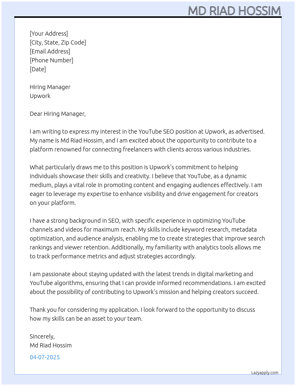 Check out these youtube seo cover letter sample and examples previously used by job seekers to land on job interviews as youtube seo. Use our AI cover letter generator to create a personalized cover letter as youtube seo.