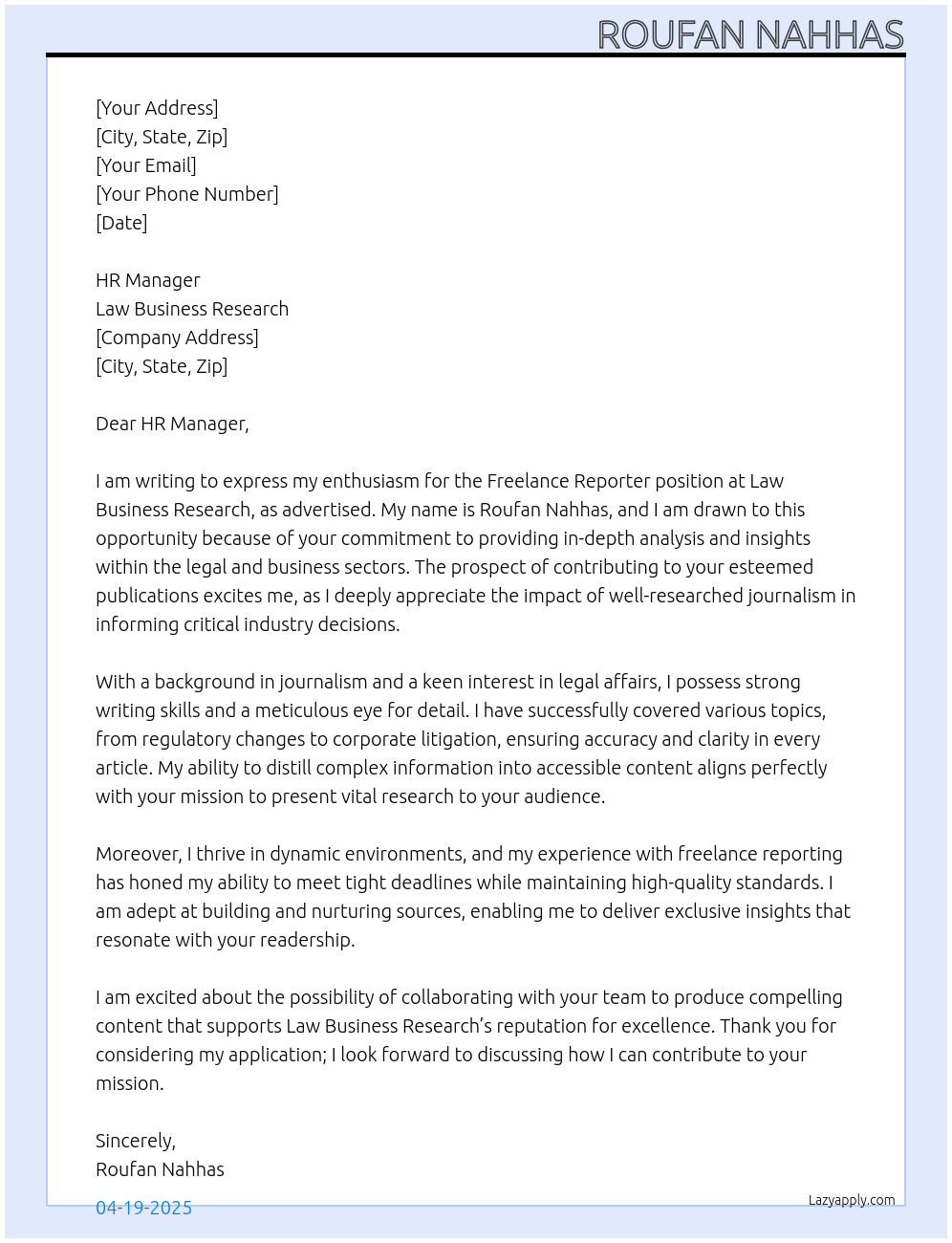 Check out these freelance reporter cover letter sample and examples previously used by job seekers to land on job interviews as freelance reporter. Use our AI cover letter generator to create a personalized cover letter as freelance reporter.