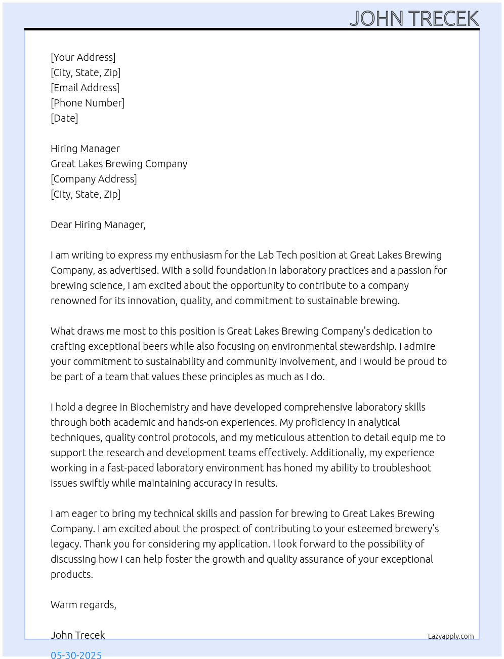 Lab Tech Cover Letter At Great Lakes Brewing Company