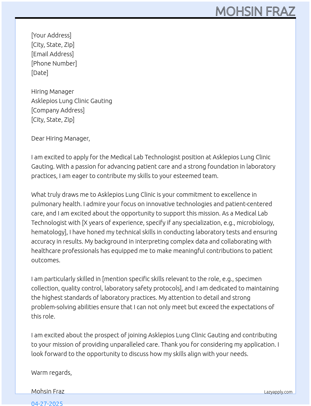 Medical Lab Technologist Cover Letter At Asklepios Lung Clinic Gauting