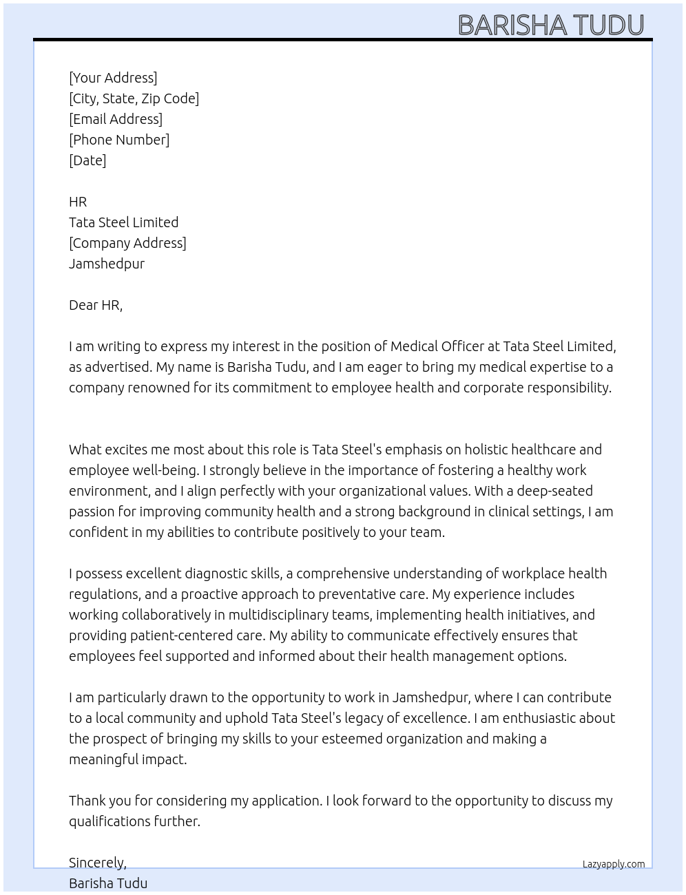 Medical Officer- TMH Cover Letter At Tata Steel limited