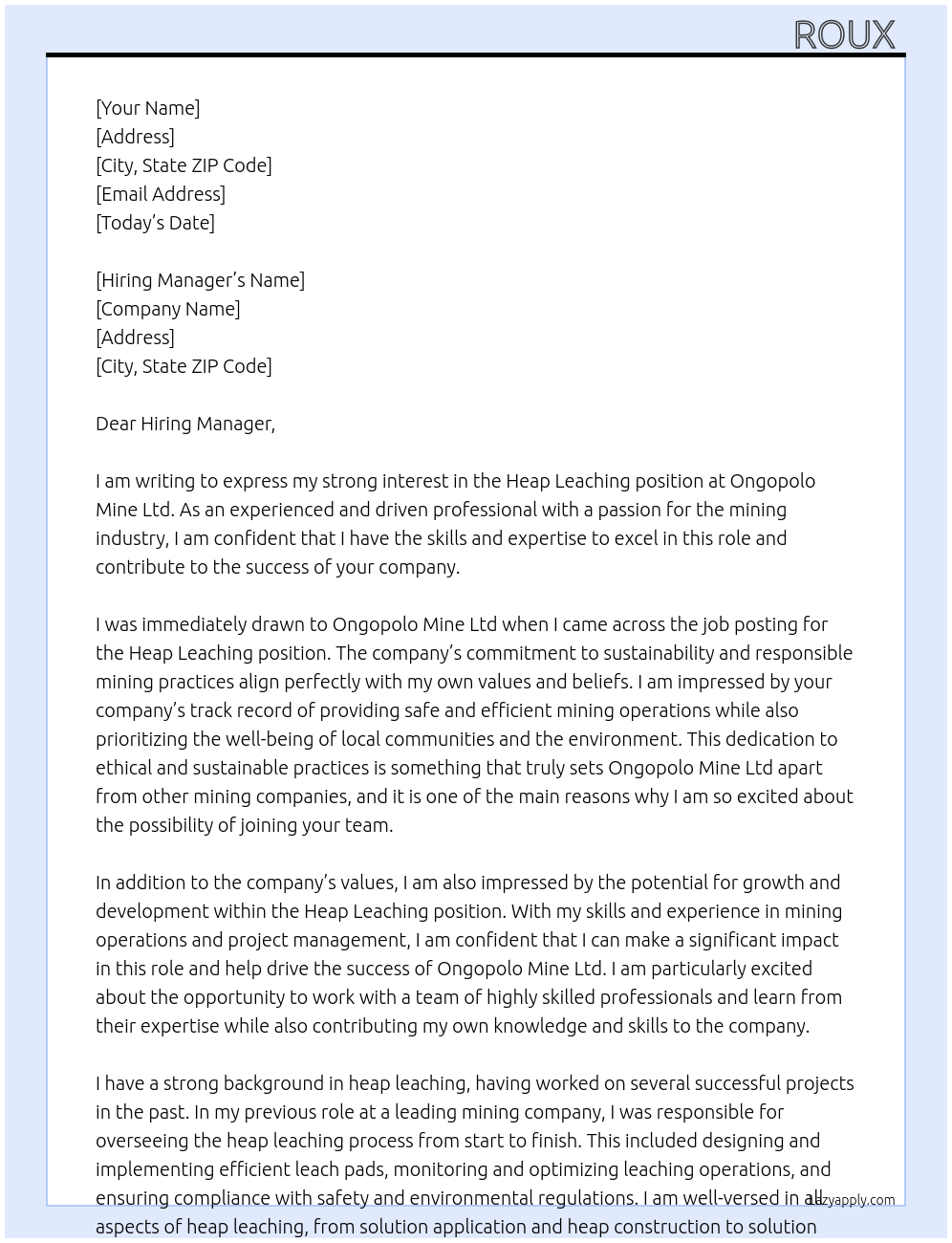 Check out these heap leaching cover letter sample and examples previously used by job seekers to land on job interviews as heap leaching. Use our AI cover letter generator to create a personalized cover letter as heap leaching.