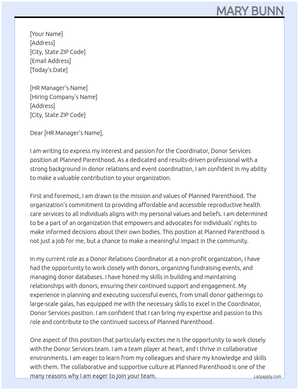 Coordinator, Donor Services Cover Letter At Planned Parenthood