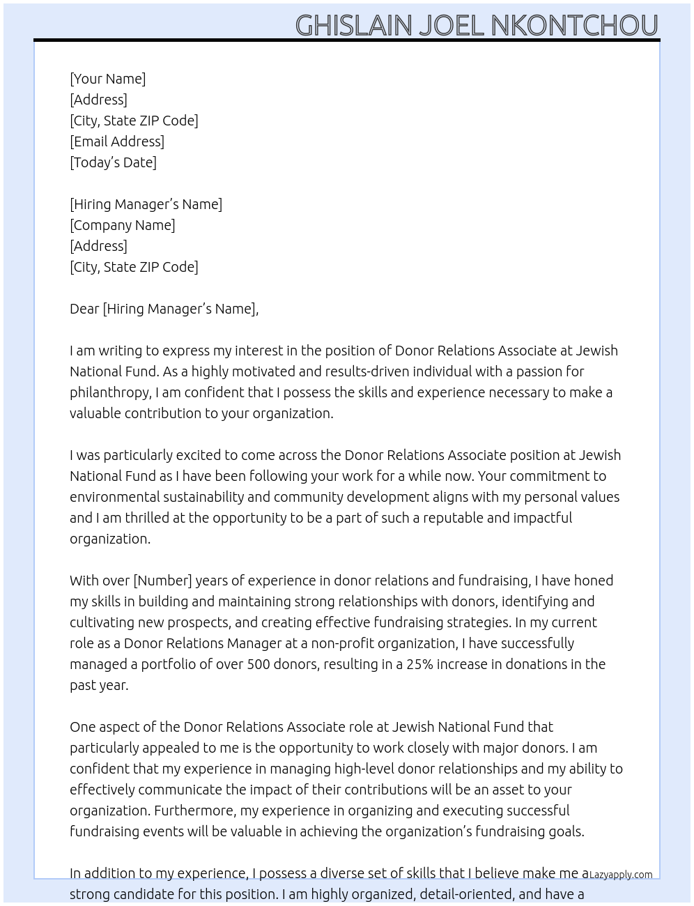 Donor Relations Associate Cover Letter At Jewish National Fund