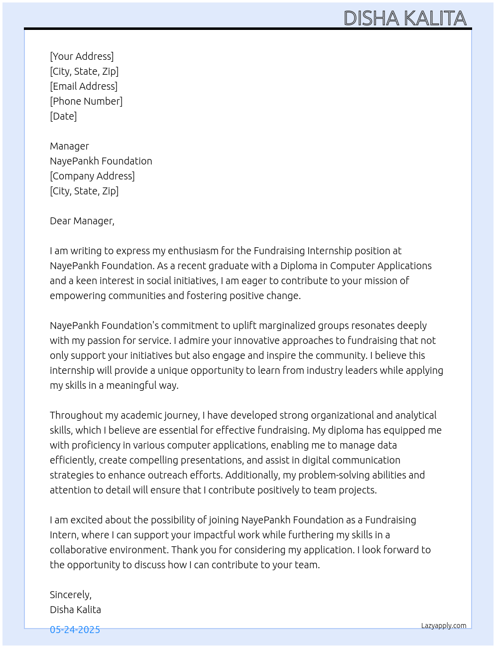 Check out these fundraising internship cover letter sample and examples previously used by job seekers to land on job interviews as fundraising internship. Use our AI cover letter generator to create a personalized cover letter as fundraising internship.