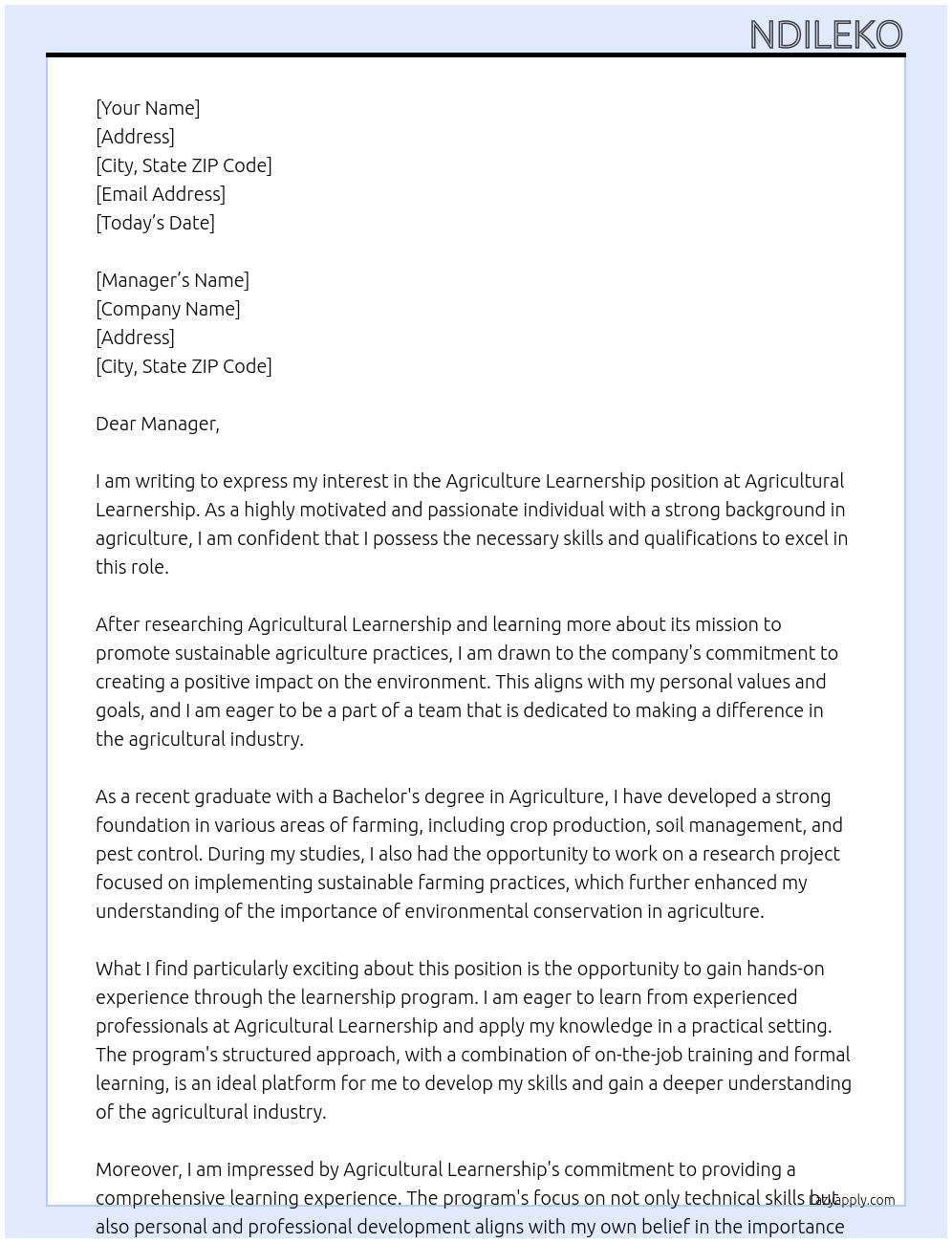 Check out these agriculture learnership cover letter sample and examples previously used by job seekers to land on job interviews as agriculture learnership. Use our AI cover letter generator to create a personalized cover letter as agriculture learnership.