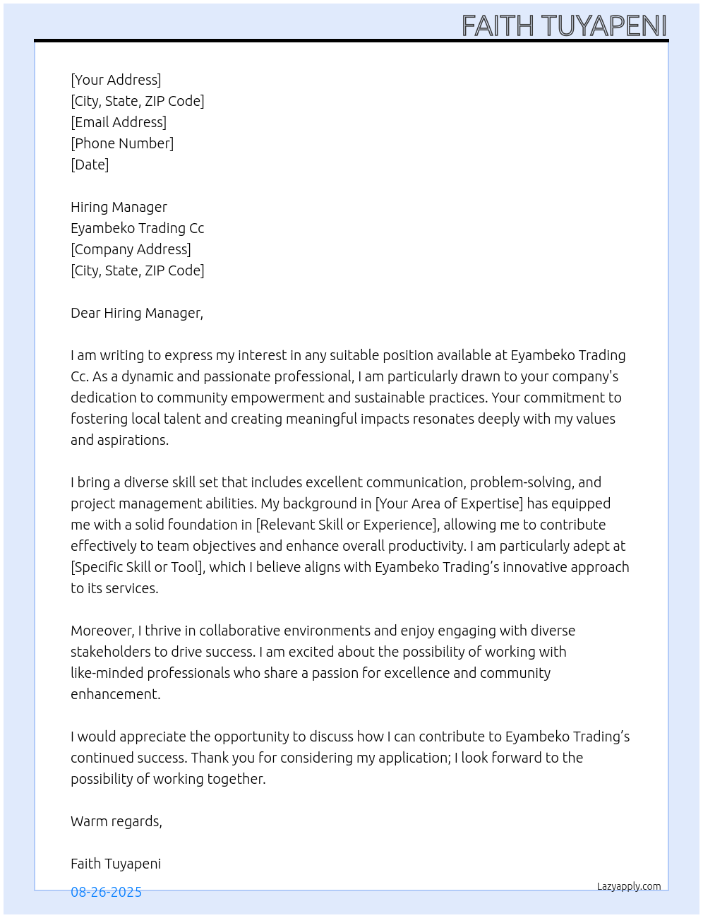 Cover letter for any suitable position available - LazyApply