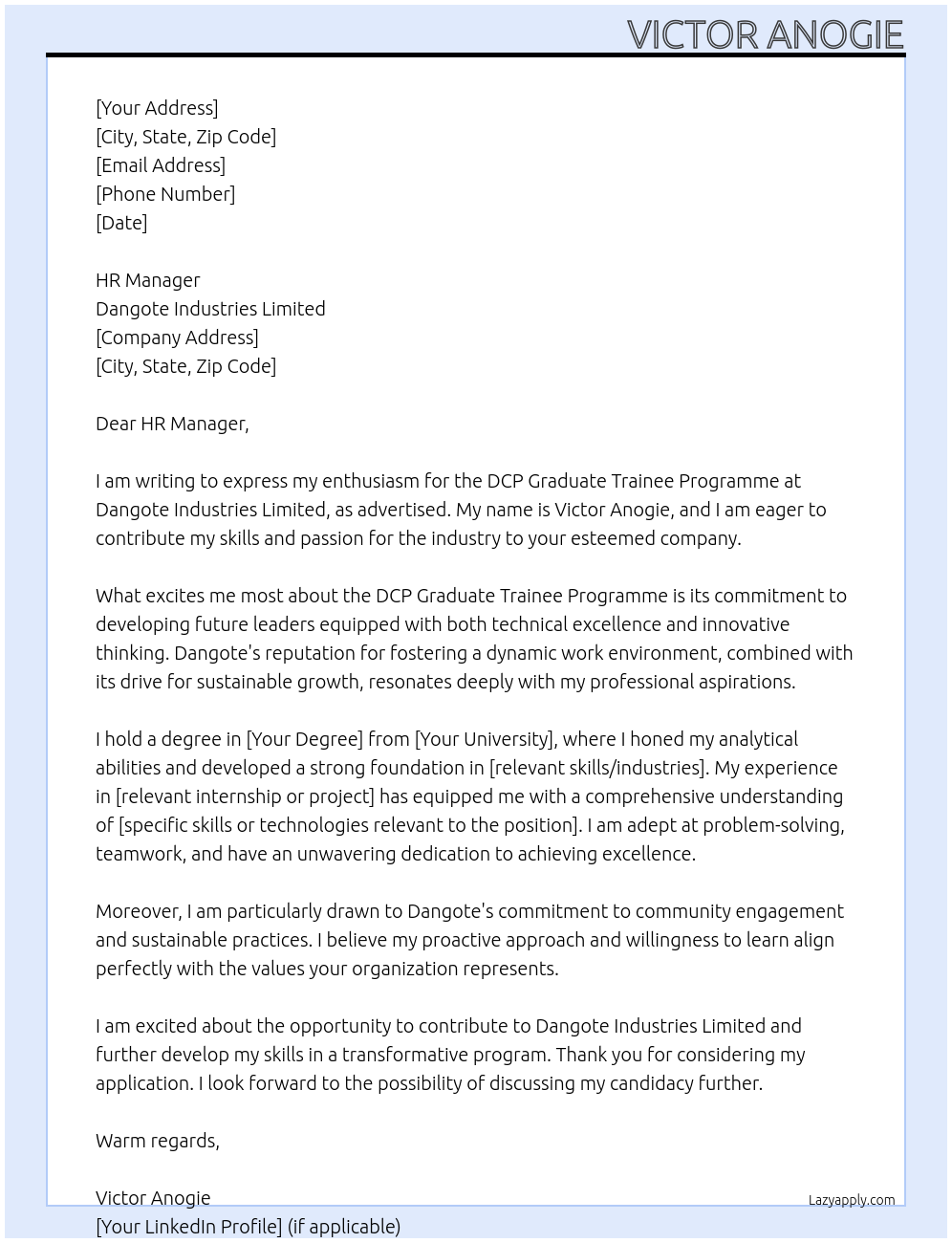 DCP Graduate Trainee Programme Cover Letter At Dangote Industries Limited