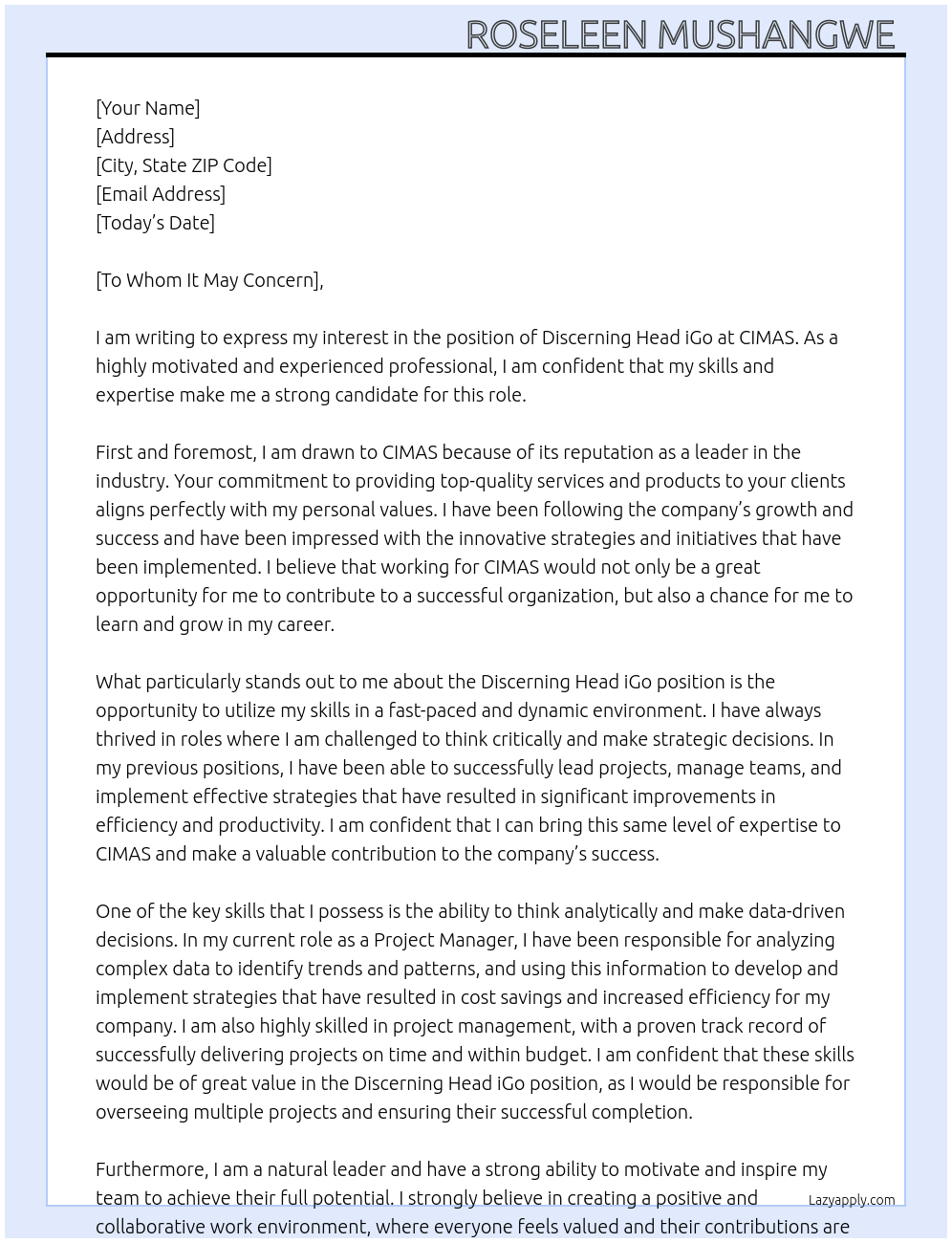Check out these discerning head igo cover letter sample and examples previously used by job seekers to land on job interviews as discerning head igo. Use our AI cover letter generator to create a personalized cover letter as discerning head igo.
