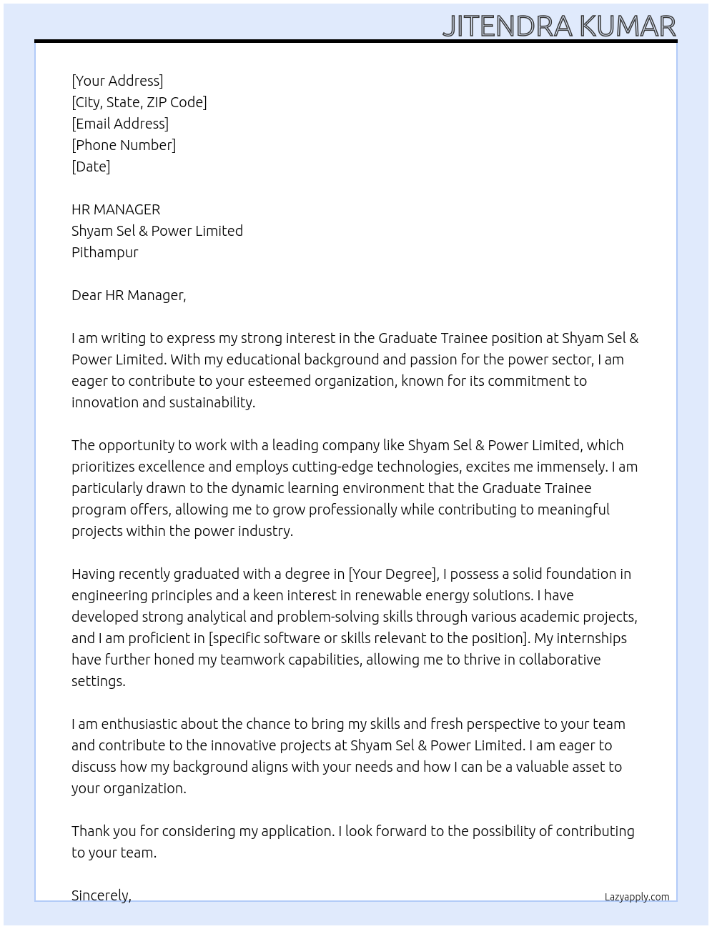 Graduate Trainees Cover Letter At SHYAM SEL $ POWER LIMITED PITHAMPUR