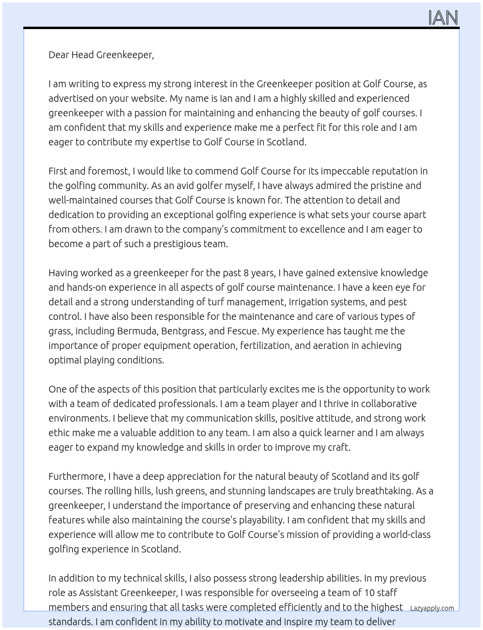 Check out these greenkeeper cover letter sample and examples previously used by job seekers to land on job interviews as greenkeeper. Use our AI cover letter generator to create a personalized cover letter as greenkeeper.