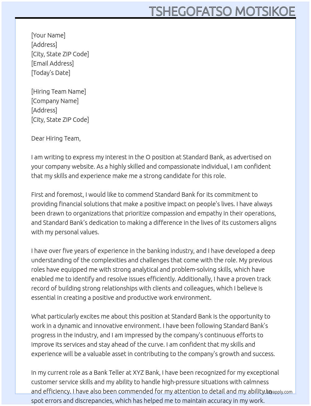 Check out these o cover letter sample and examples previously used by job seekers to land on job interviews as o. Use our AI cover letter generator to create a personalized cover letter as o.