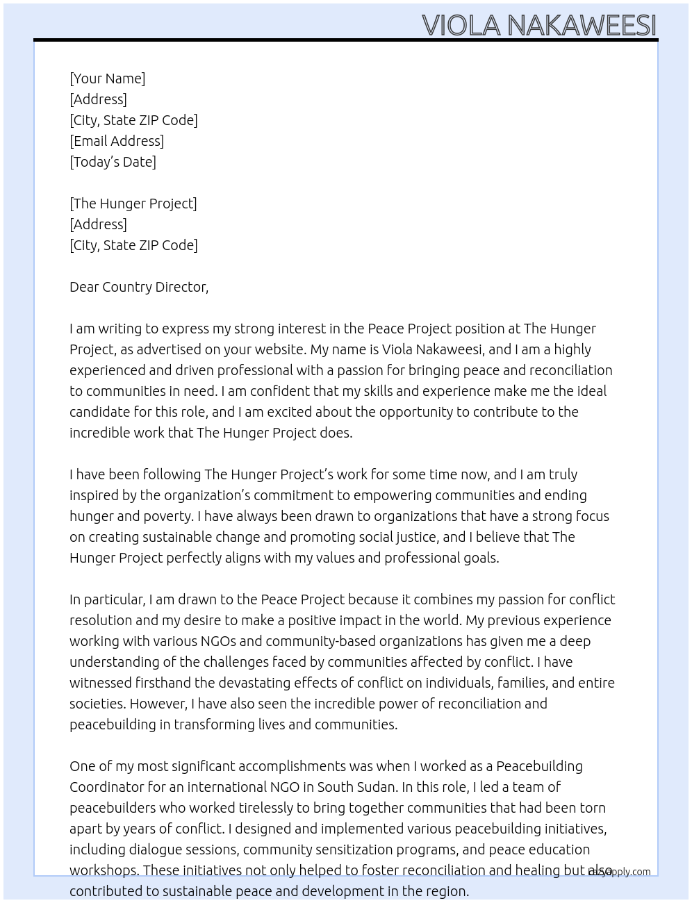 Check out these peace project cover letter sample and examples previously used by job seekers to land on job interviews as peace project. Use our AI cover letter generator to create a personalized cover letter as peace project.