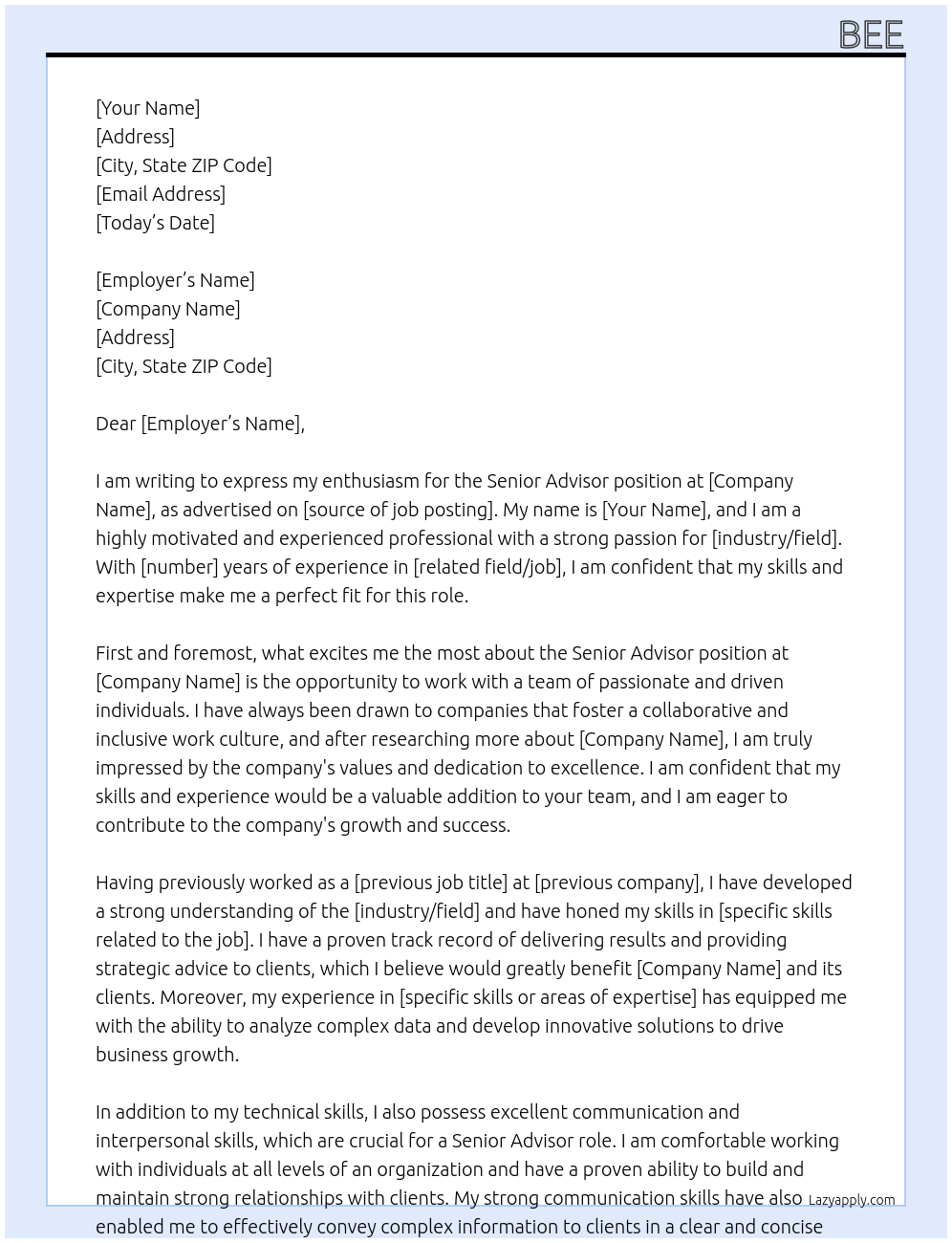 Senior Advisor Cover Letter At bee