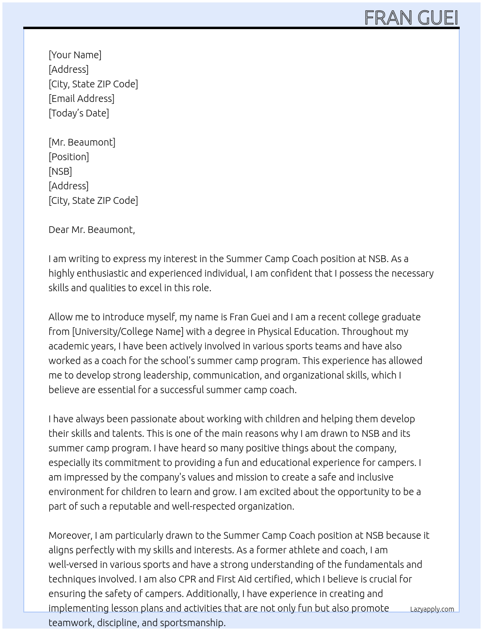 Check out these summer camp coach cover letter sample and examples previously used by job seekers to land on job interviews as summer camp coach. Use our AI cover letter generator to create a personalized cover letter as summer camp coach.