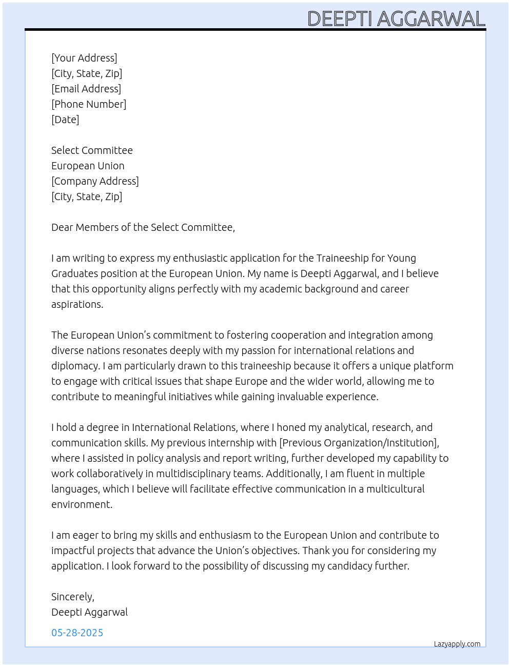 traineeship for young graduates Cover Letter At European Union