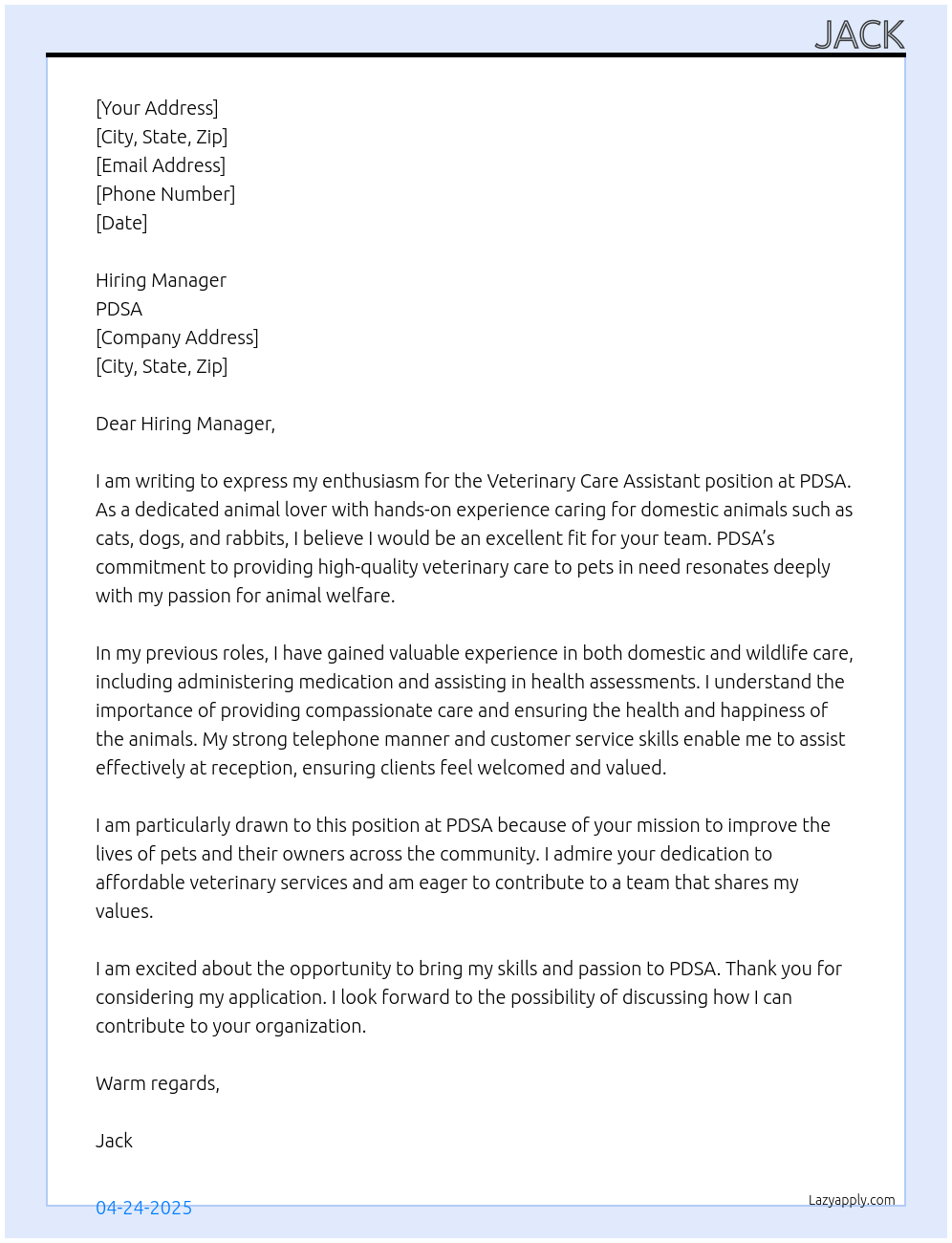 Check out these veterianry care assistant cover letter sample and examples previously used by job seekers to land on job interviews as veterianry care assistant. Use our AI cover letter generator to create a personalized cover letter as veterianry care assistant.