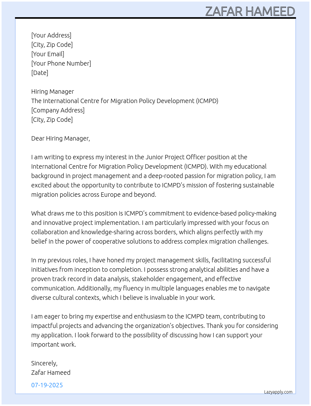 Junior project officer At The International Centre for Migration Policy Development (ICMPD) Cover Letter