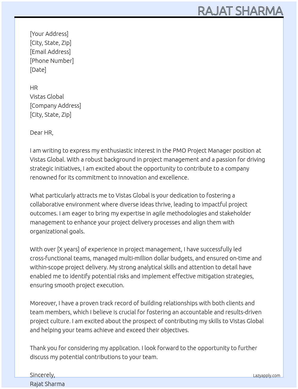 Check out these pmo project manager cover letter sample and examples previously used by job seekers to land on job interviews as pmo project manager. Use our AI cover letter generator to create a personalized cover letter as pmo project manager.