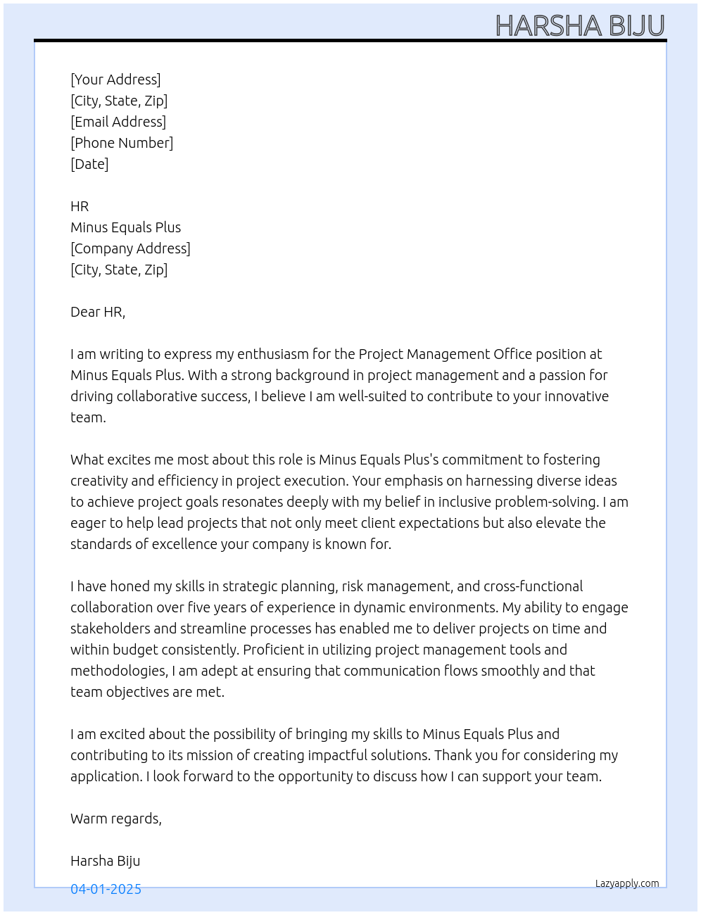Check out these project management office cover letter sample and examples previously used by job seekers to land on job interviews as project management office. Use our AI cover letter generator to create a personalized cover letter as project management office.