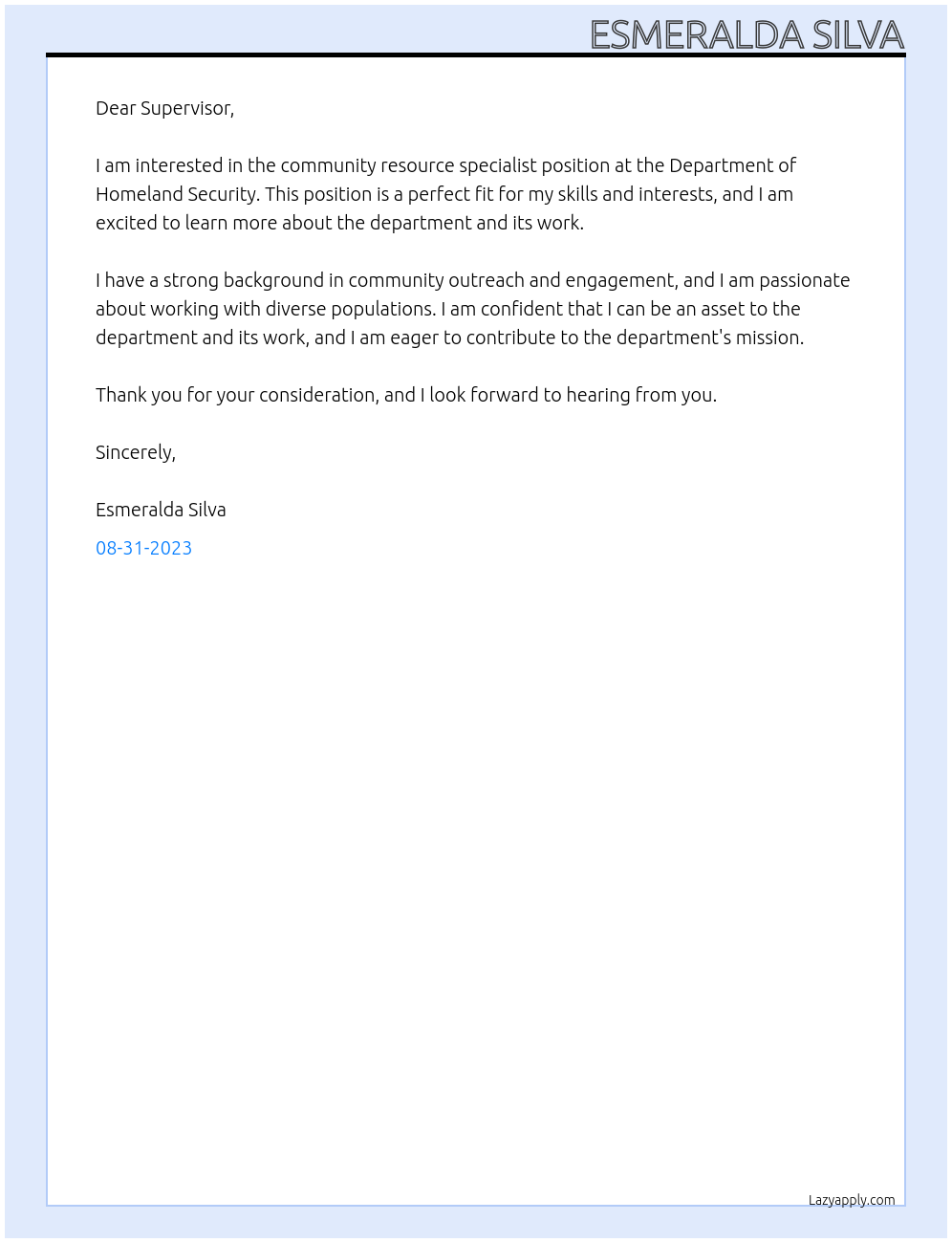 Check out these community resource specialist cover letter sample and examples previously used by job seekers to land on job interviews as community resource specialist. Use our AI cover letter generator to create a personalized cover letter as community resource specialist.