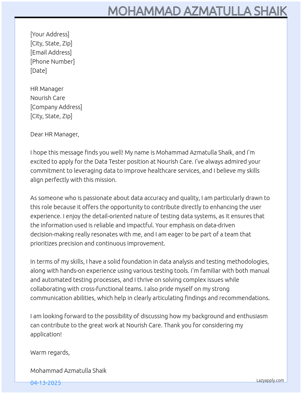 Data Tester At Nourish Care Cover Letter