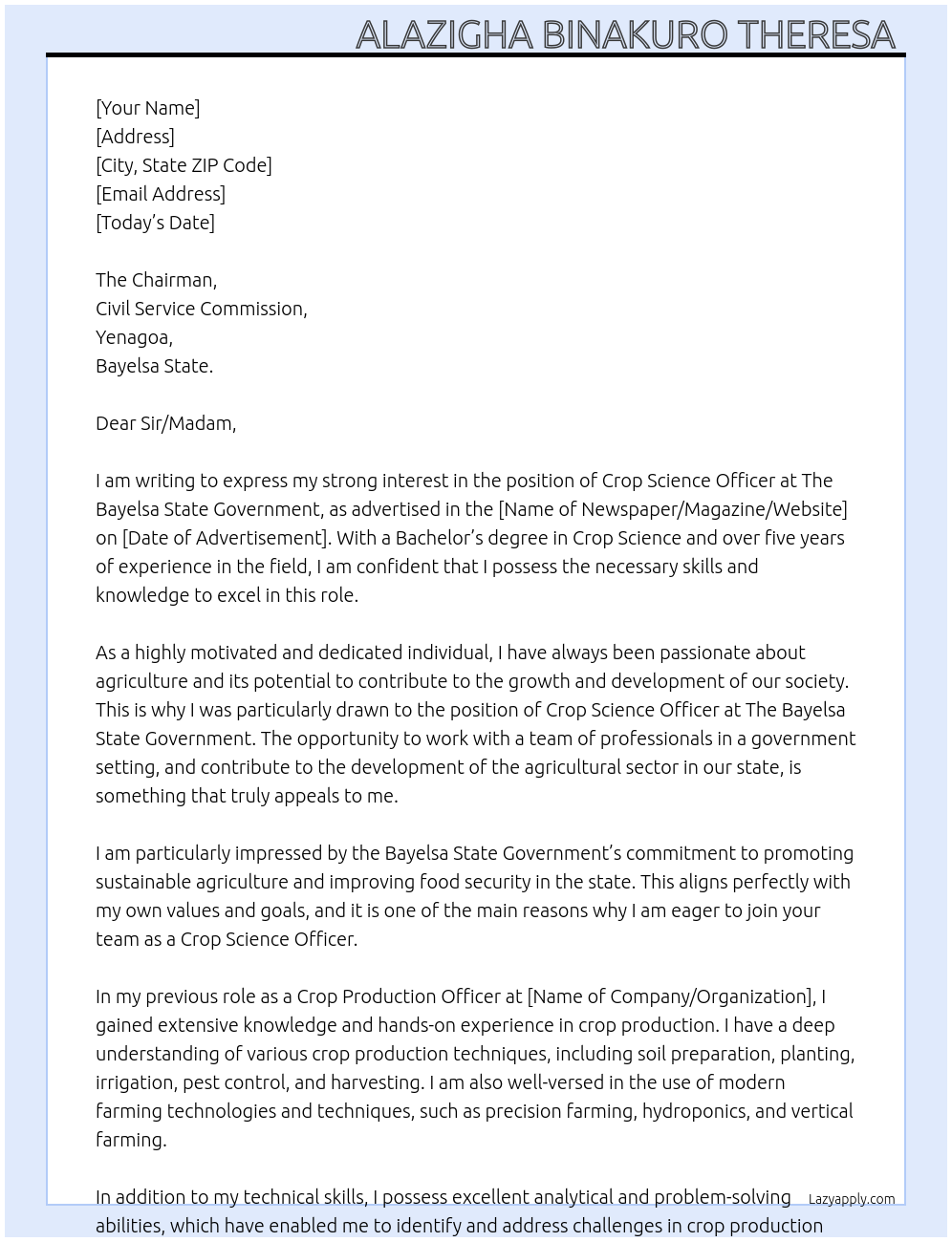 Crop science officer Cover Letter At The bayelsa state government