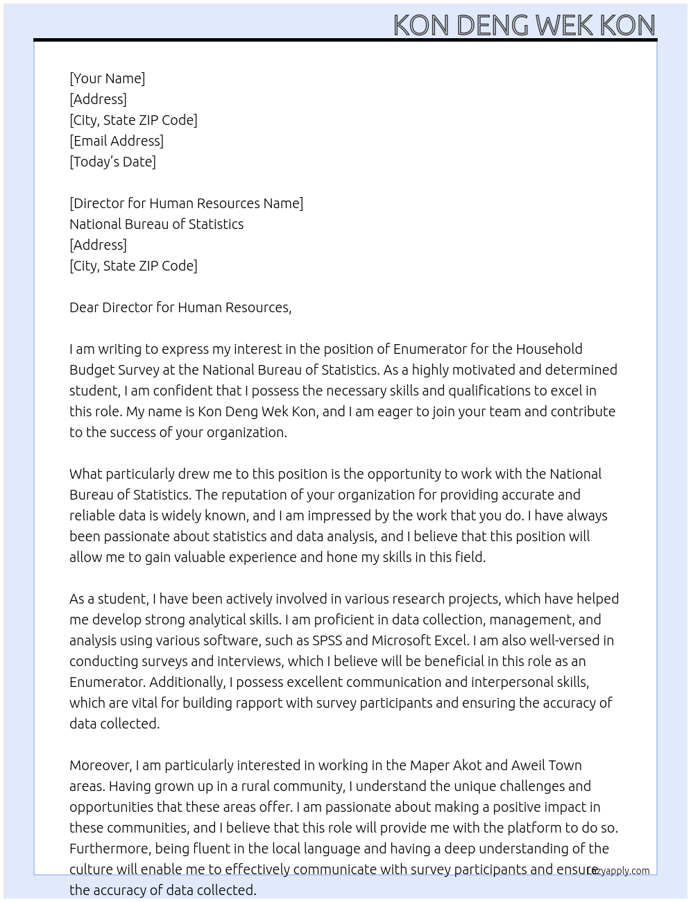 Enumerator, Household Budget Survey Cover Letter Examples And Template