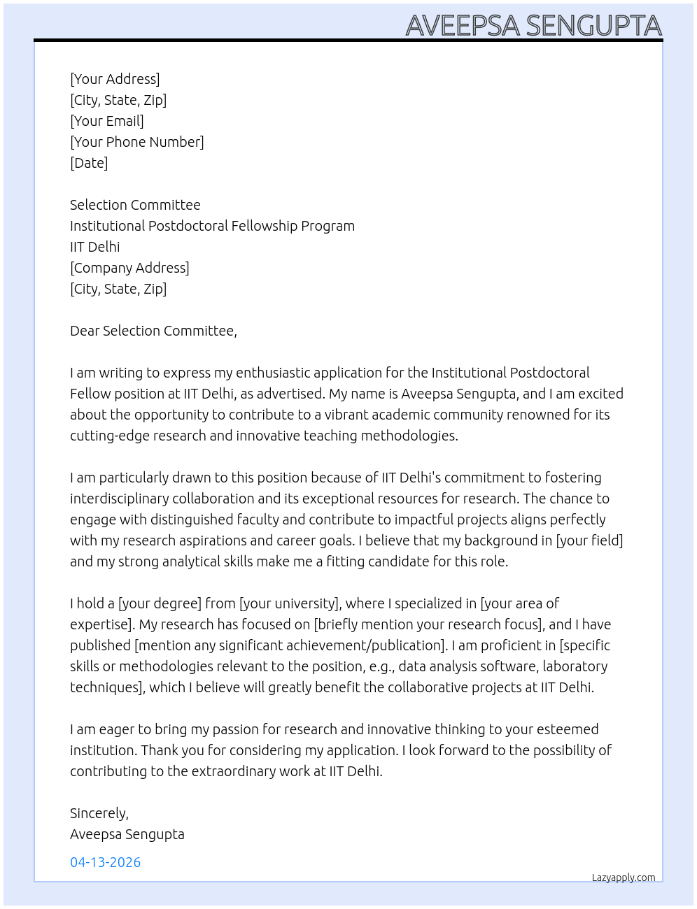 institutional postdoctoral fellow Cover Letter At IIT Delhi