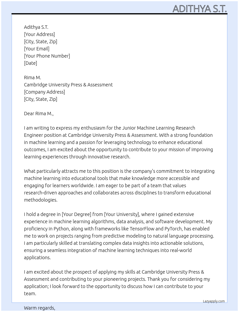Junior Machine Learning Research Engineer Cover Letter At Cambridge University Press & Assessment
