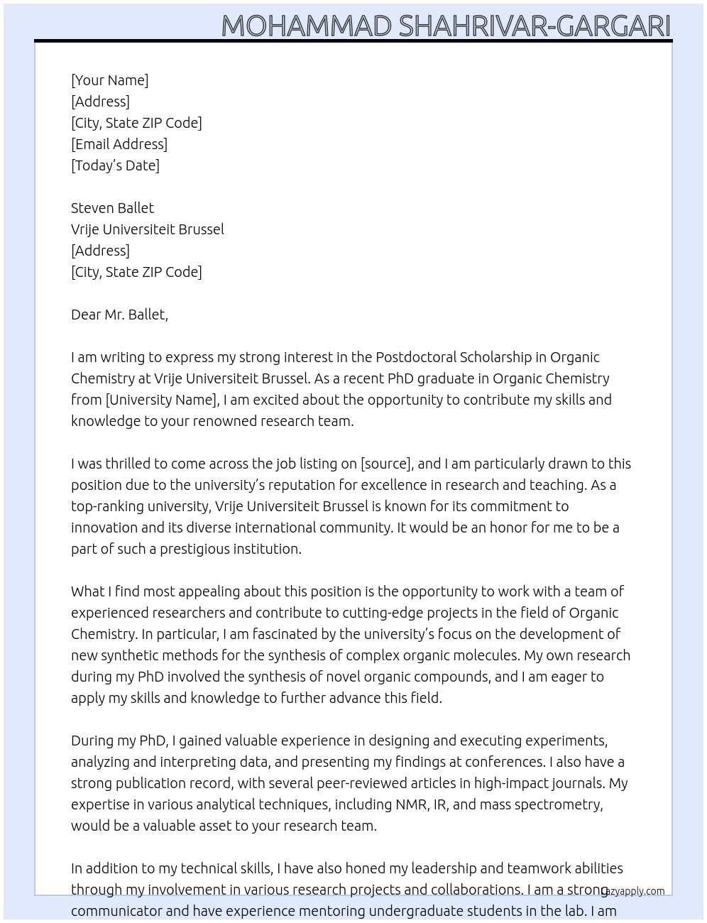 Postdoctoral scholarship Organic Chemistry Cover Letter At Vrije Universiteit Brussel