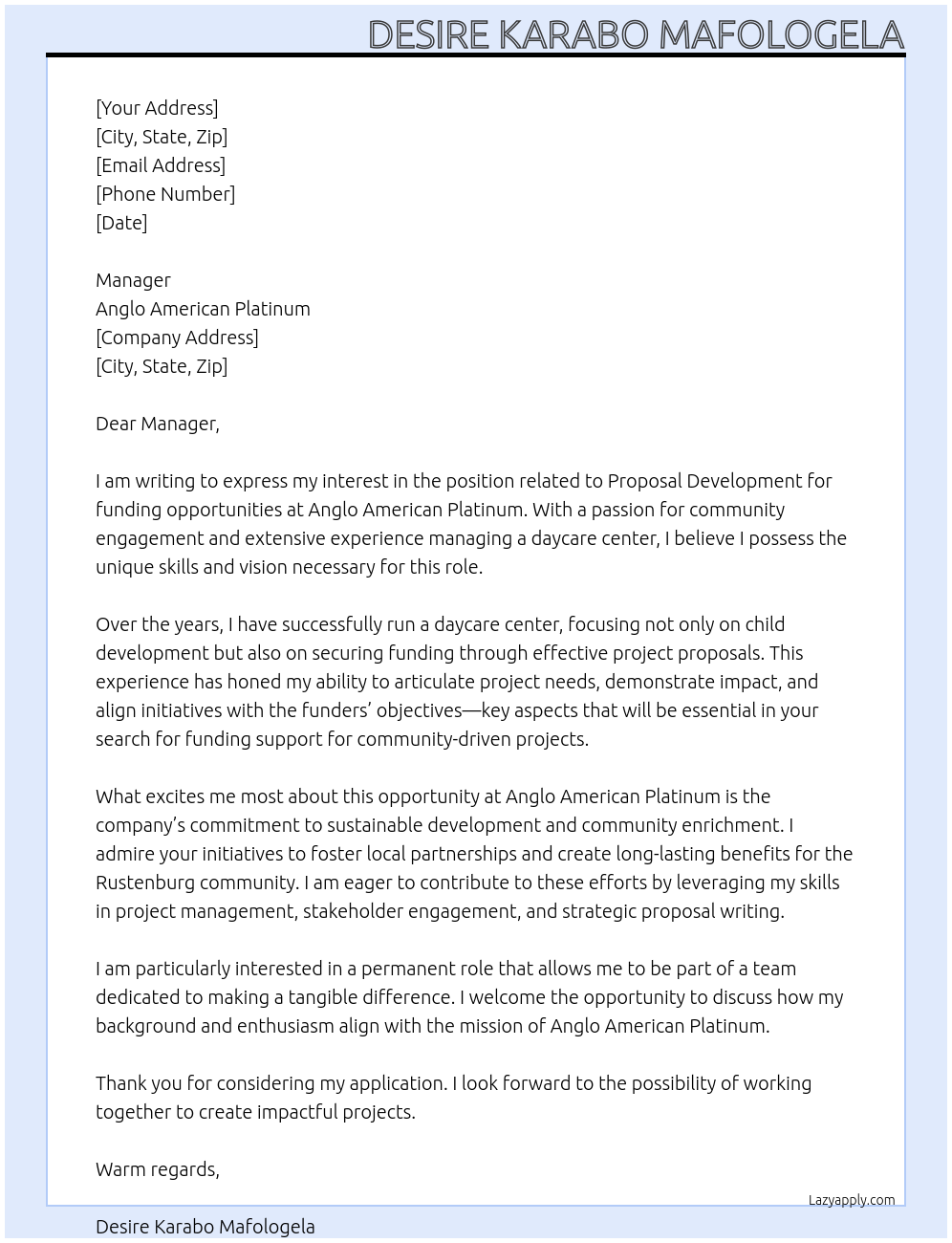 Proposal letter for funding Cover Letter At Anglo American Platinum