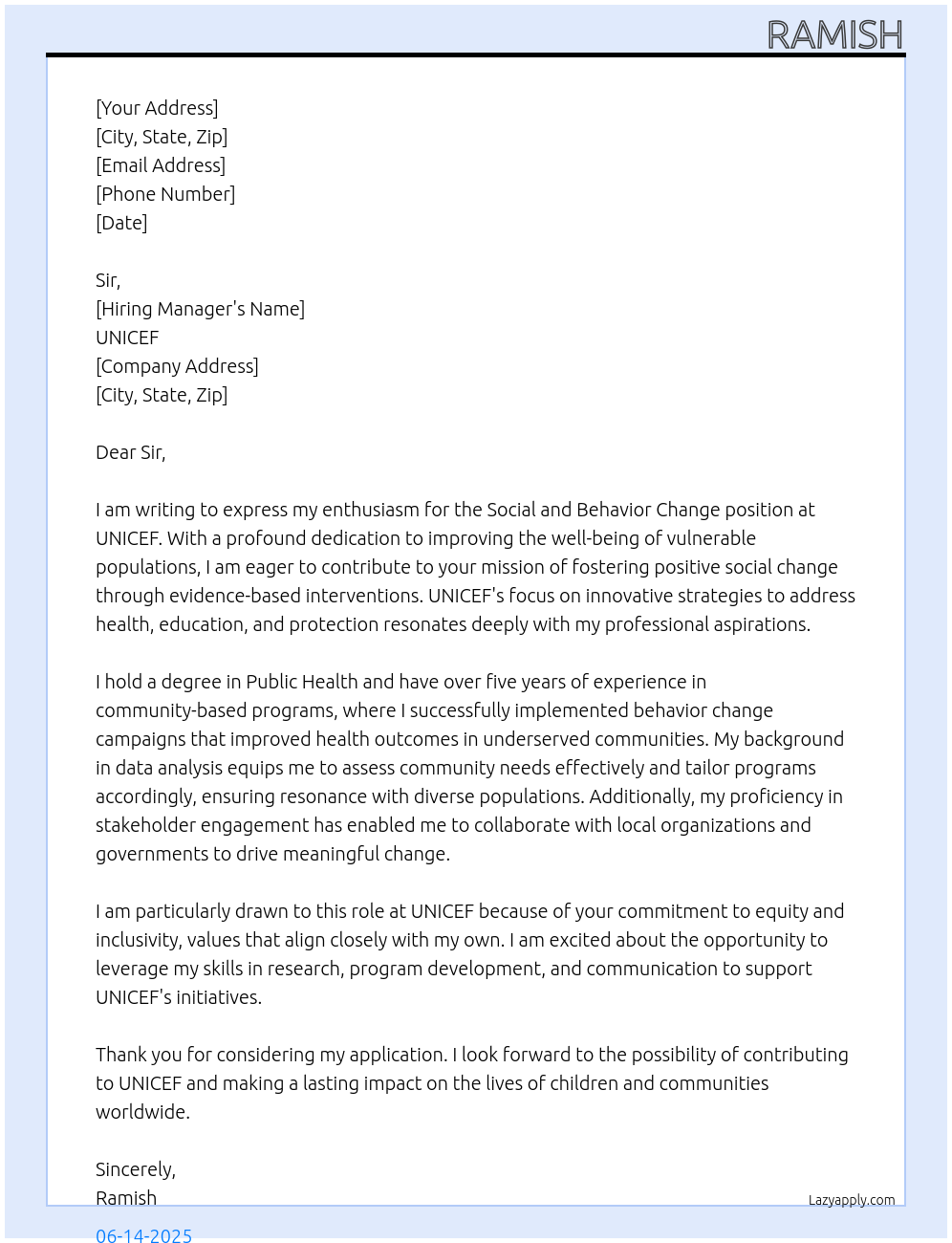 Check out these social & behavior change cover letter sample and examples previously used by job seekers to land on job interviews as social & behavior change. Use our AI cover letter generator to create a personalized cover letter as social & behavior change.