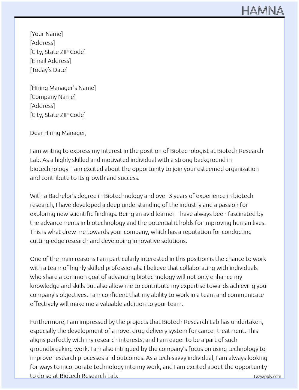 Check out these biotecnologist cover letter sample and examples previously used by job seekers to land on job interviews as biotecnologist. Use our AI cover letter generator to create a personalized cover letter as biotecnologist.
