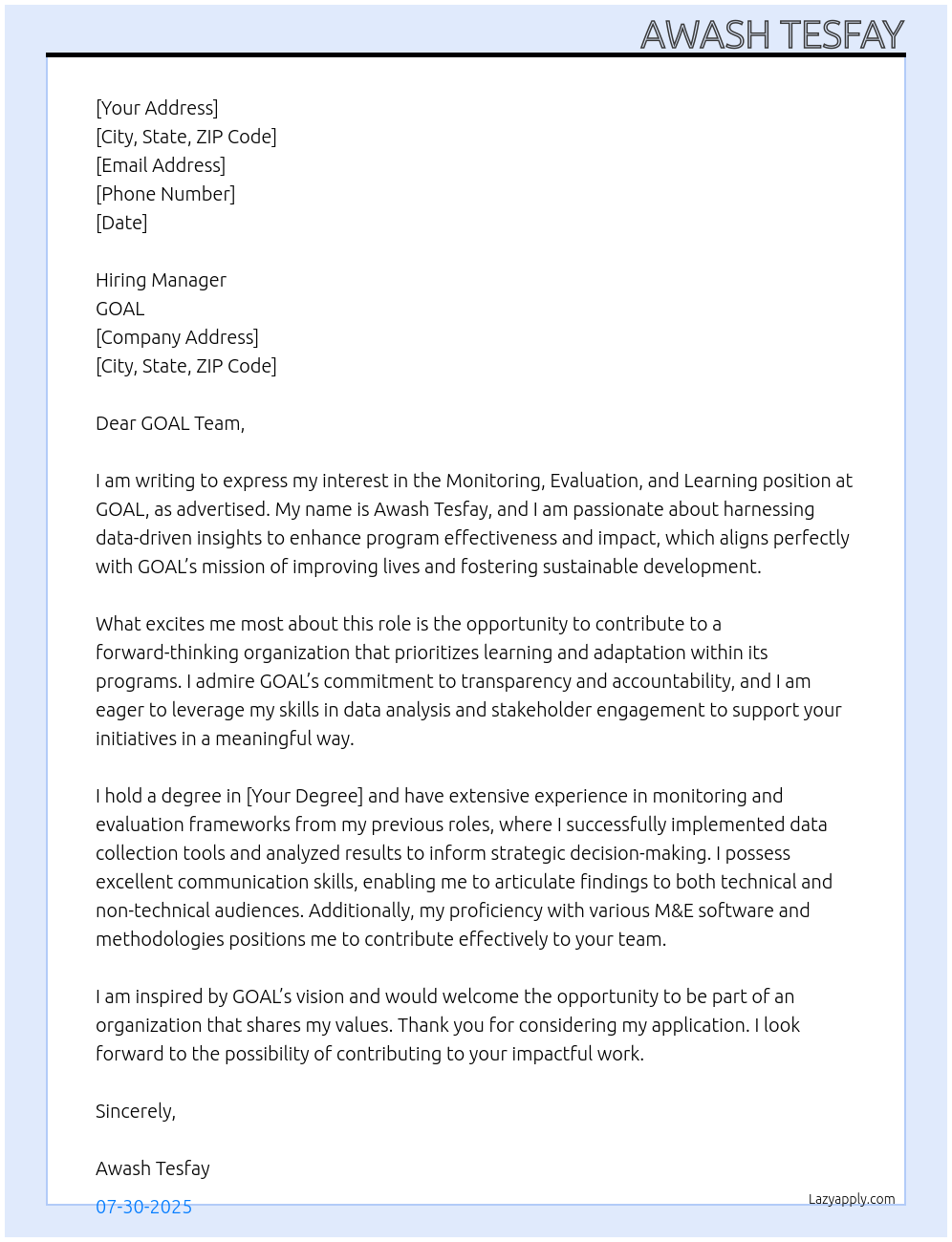 Monitoring, Evaluation And Learning Cover Letter Examples