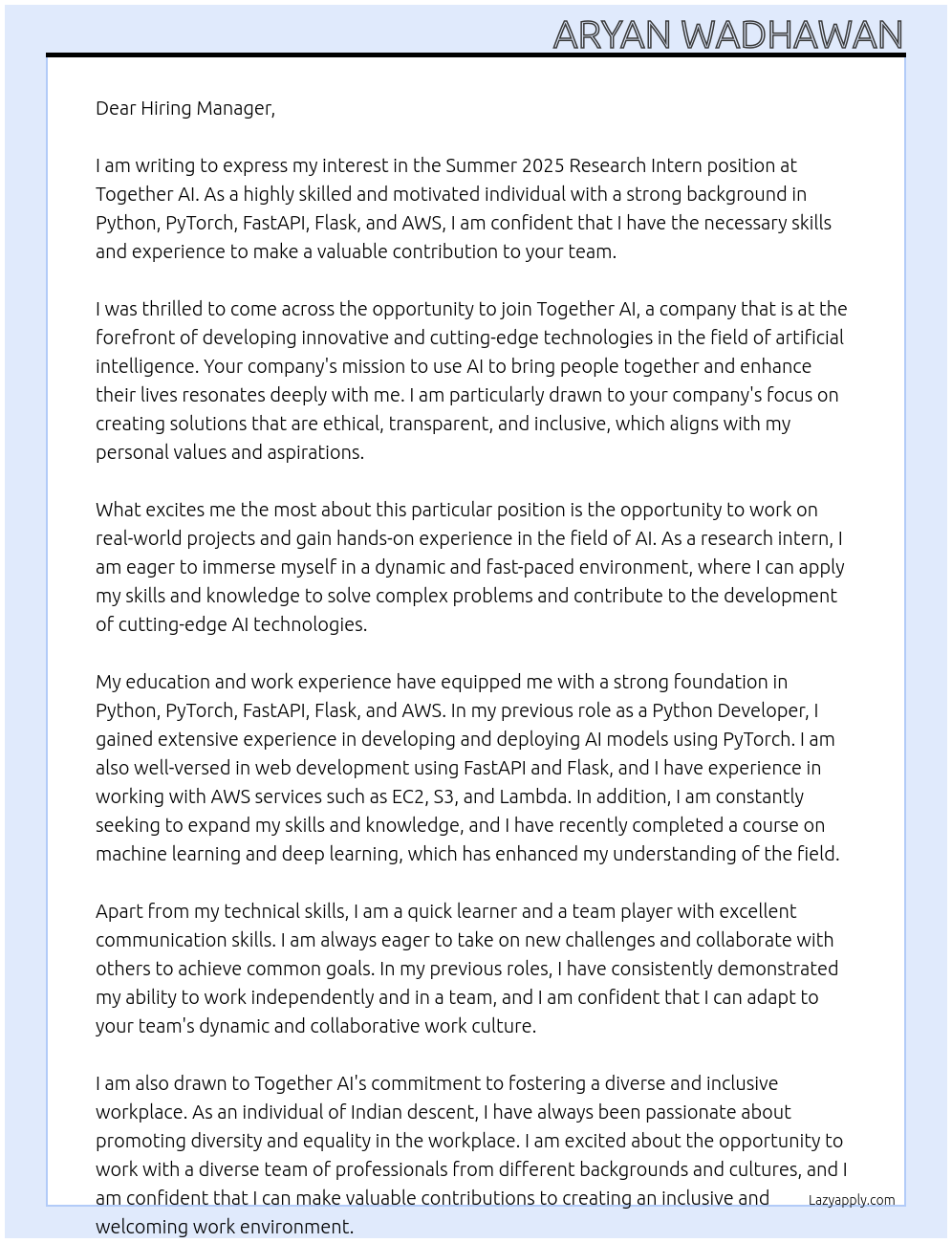 Check out these summer 2025 research intern cover letter sample and examples previously used by job seekers to land on job interviews as summer 2025 research intern. Use our AI cover letter generator to create a personalized cover letter as summer 2025 research intern.