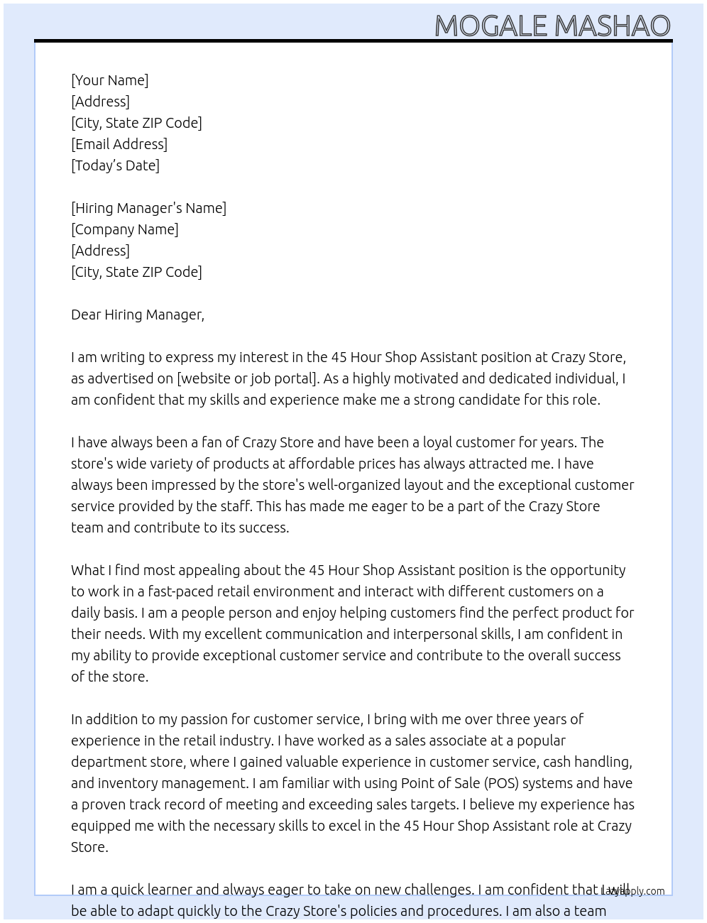 45 Hour Shop Assistant Cover Letter At Crazy Store