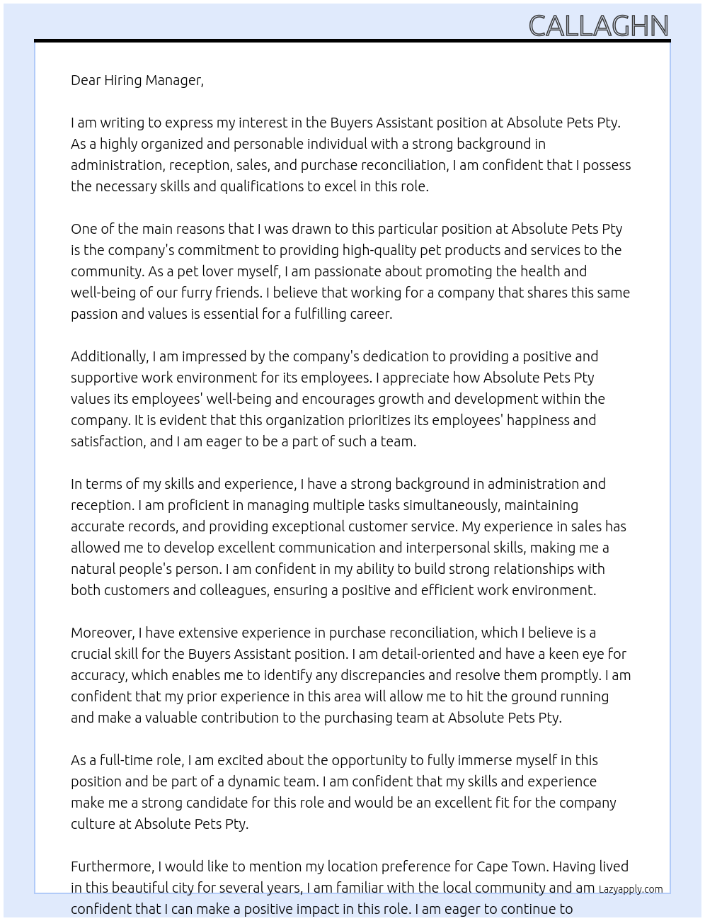 Buyers assistant Cover Letter At Absolute Pets Pty