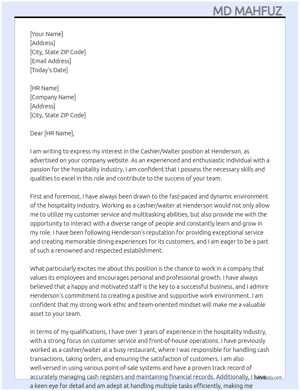 Check out these cashier/waiter cover letter sample and examples previously used by job seekers to land on job interviews as cashier/waiter. Use our AI cover letter generator to create a personalized cover letter as cashier/waiter.