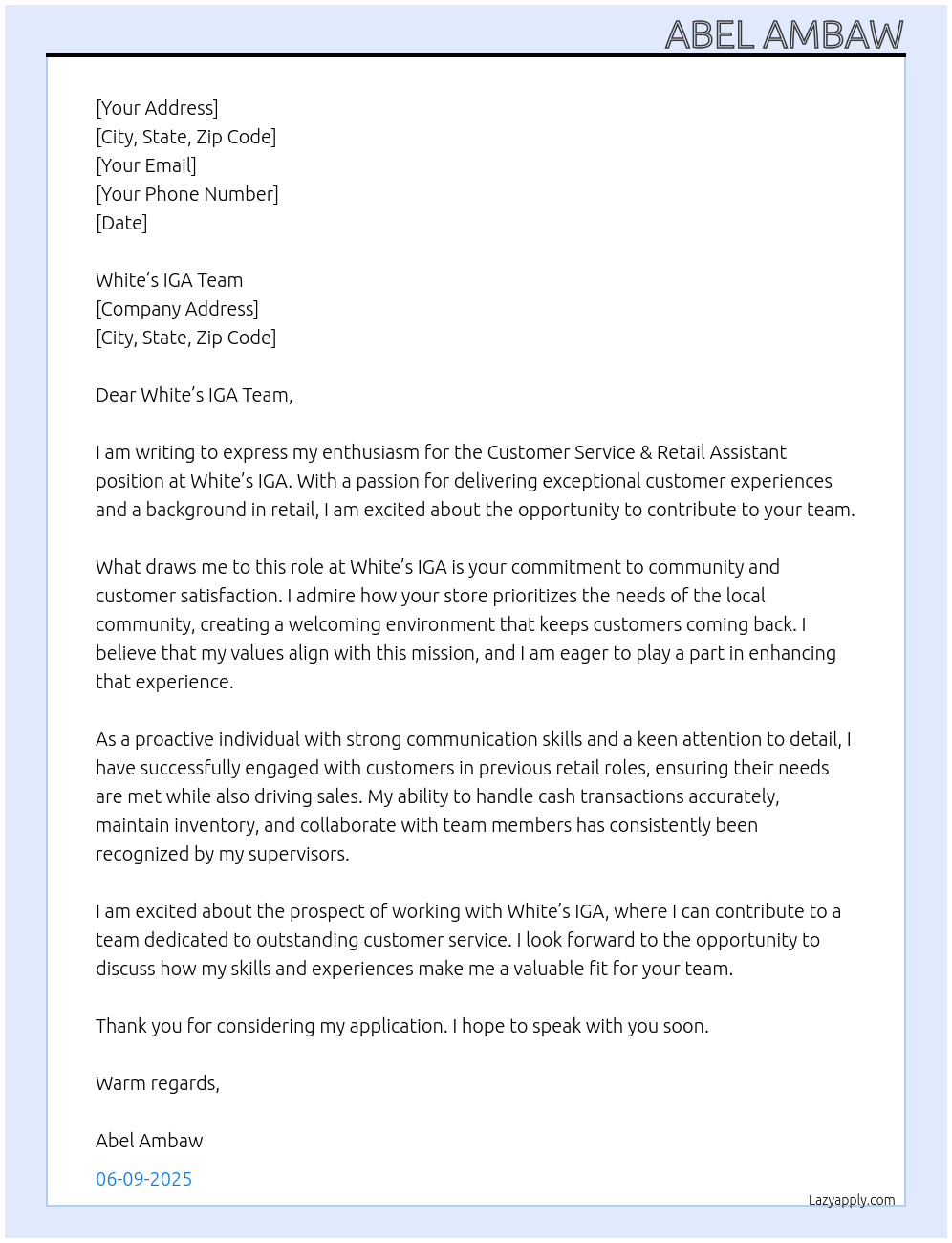 Customer Service & Retail Assistant roles Cover Letter At White’s IGA Team