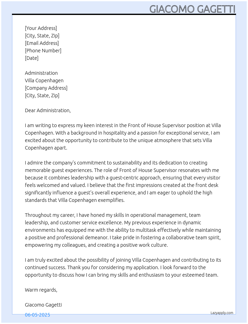 Front of house supervisor Cover Letter At Villa Copenhagen