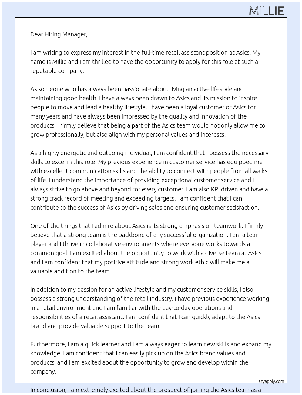 Check out these full time retail assistant cover letter sample and examples previously used by job seekers to land on job interviews as full time retail assistant. Use our AI cover letter generator to create a personalized cover letter as full time retail assistant.