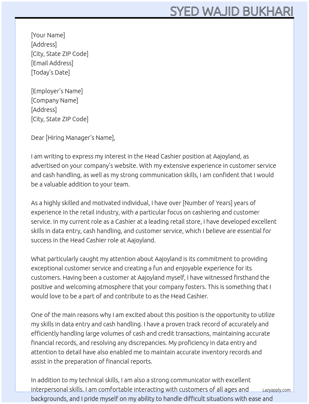 Check out these head cashier cover letter sample and examples previously used by job seekers to land on job interviews as head cashier. Use our AI cover letter generator to create a personalized cover letter as head cashier.