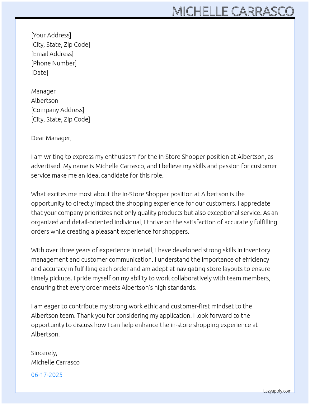 Check out these in store shopper cover letter sample and examples previously used by job seekers to land on job interviews as in store shopper. Use our AI cover letter generator to create a personalized cover letter as in store shopper.