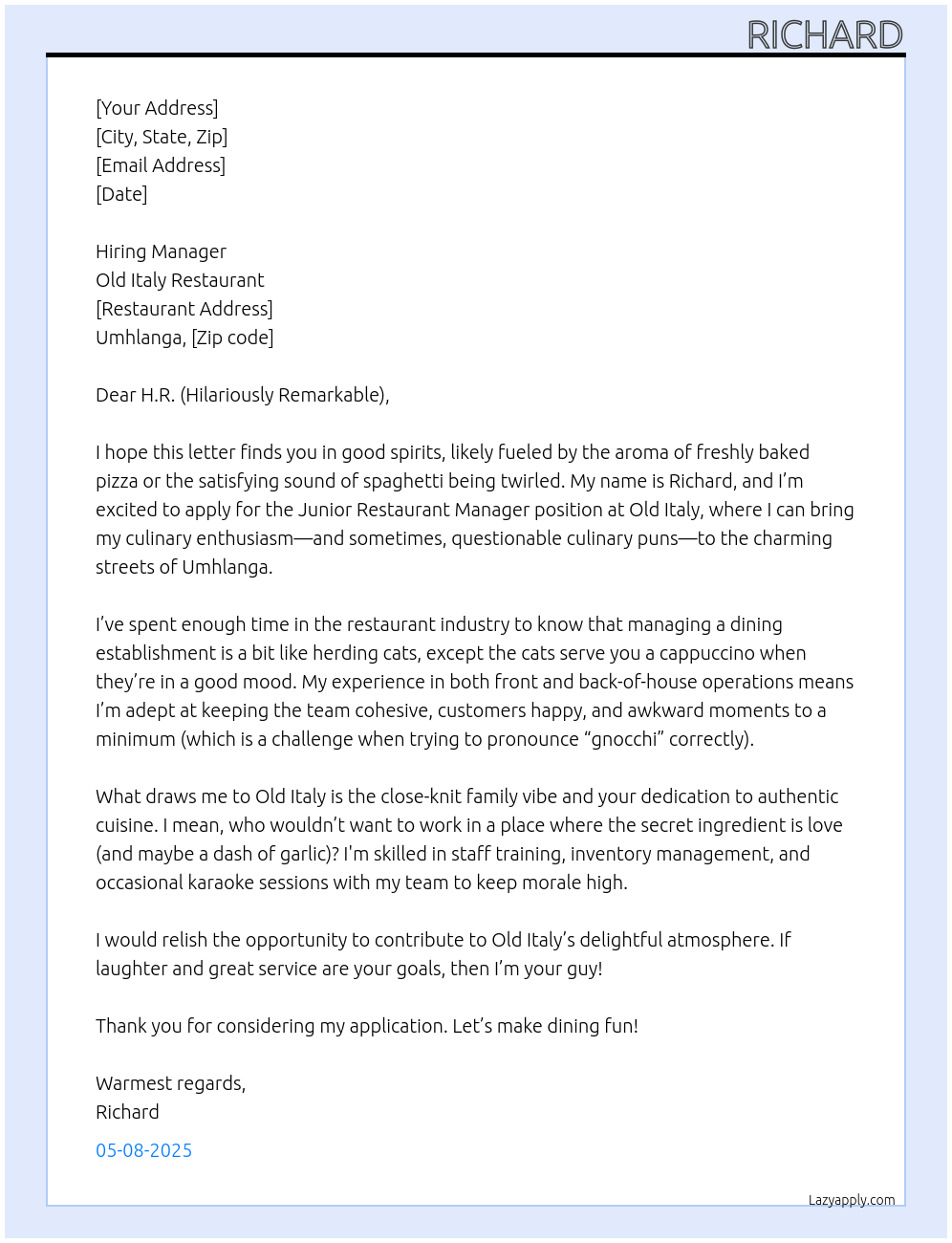 Junior restaurant manager Cover Letter At old italy restaurant