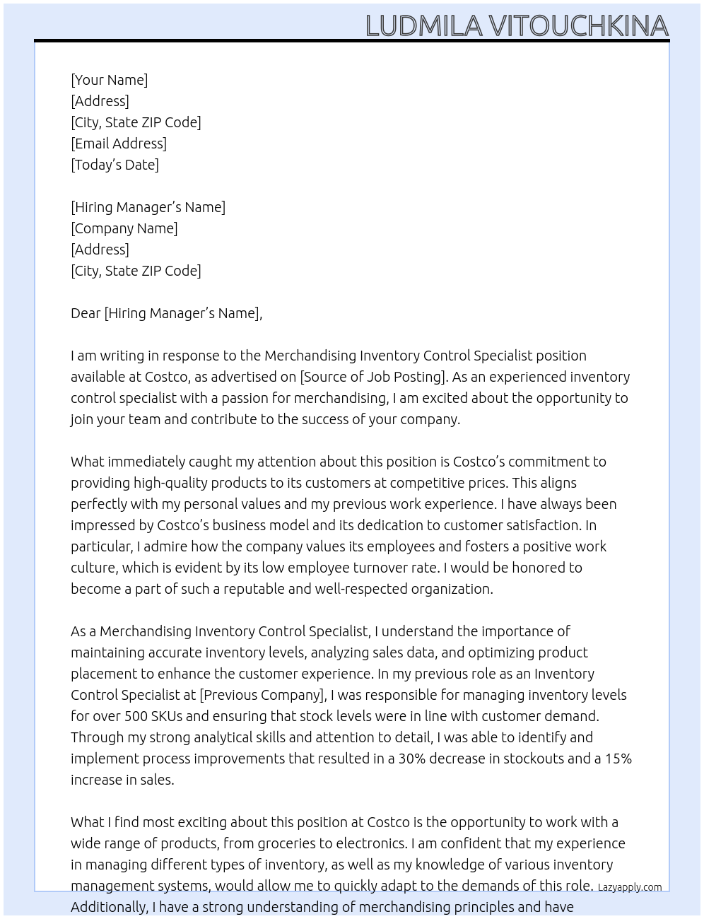 Merchandising Inventory Control Specialist Cover Letter At Costco