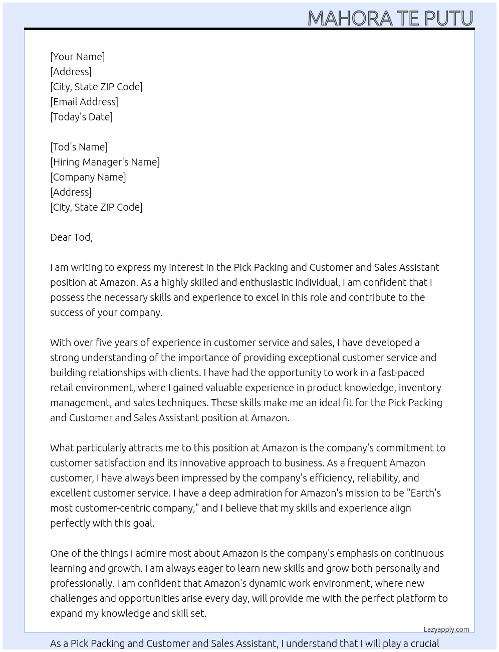 Pick Packing and Costumer and Sales assiantant Cover Letter At Amazon