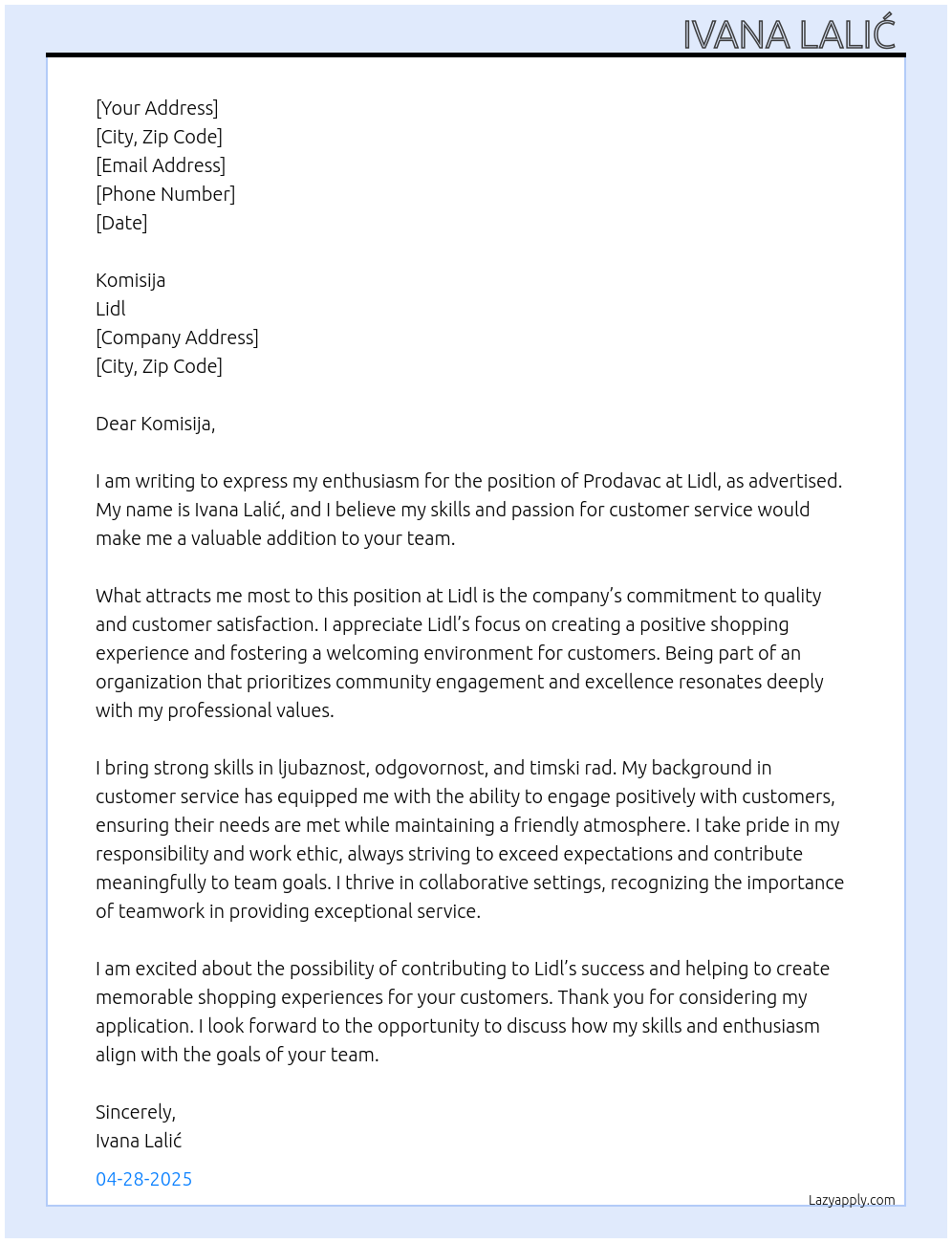 Check out these prodavac u lidlu cover letter sample and examples previously used by job seekers to land on job interviews as prodavac u lidlu. Use our AI cover letter generator to create a personalized cover letter as prodavac u lidlu.